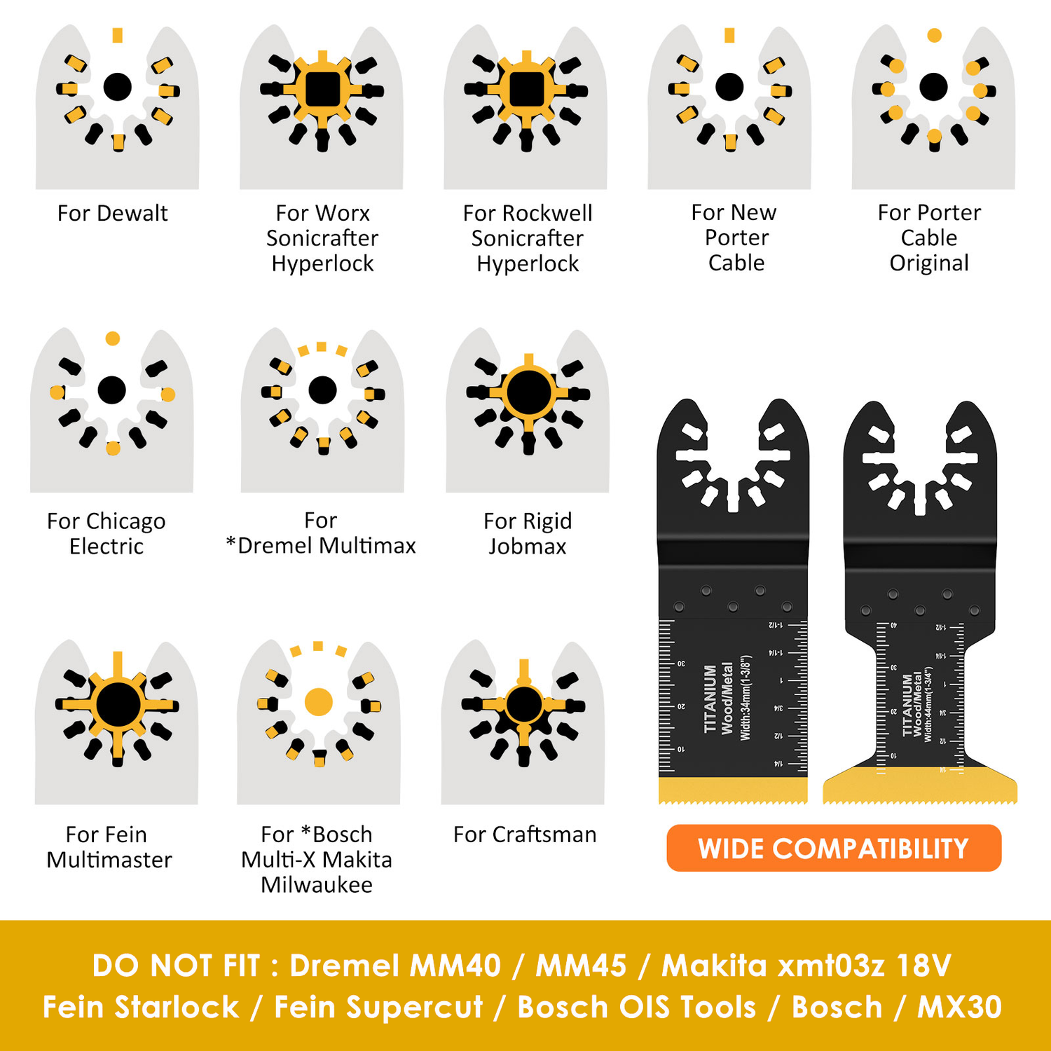 The PROMASTERTOOL™ Titanium Oscillating Saw Blades Kits are designed to work with a variety of oscillating tools, ensuring versatility for all your cutting tasks. These blades are compatible with top brands like Dewalt, Rockwell, Chicago Electric, Dremel, Rigid Jobmax, Craftsman, Makita, Bosch, and more. While offering broad compatibility, they do not fit certain models such as Dremel MM40 / MM45, Makita xmt03z 18V, and Bosch OIS tools.